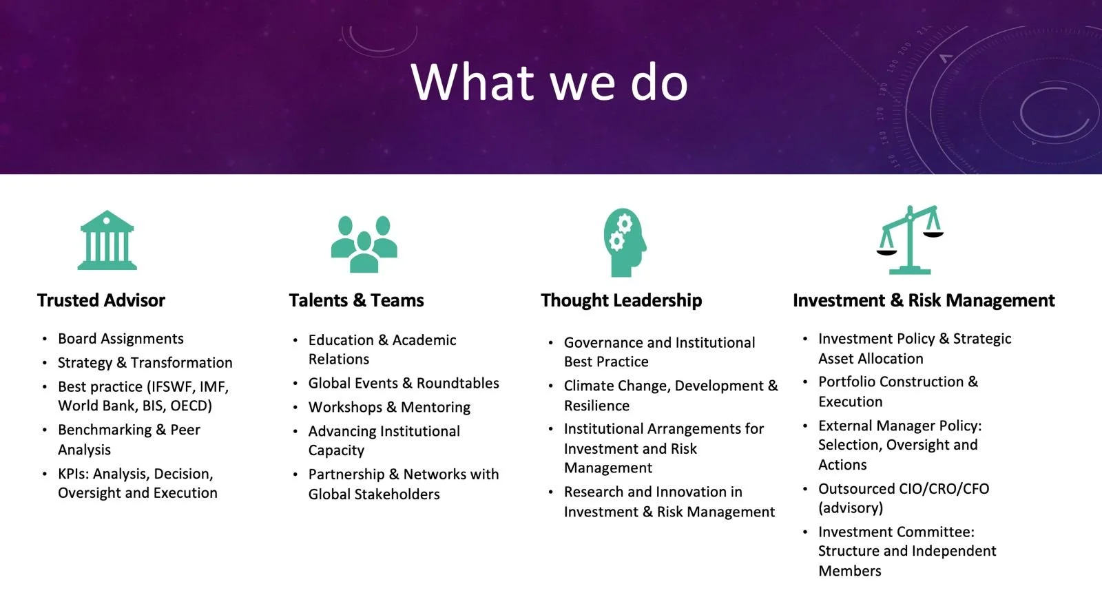 We engage as Executive Board Advisors and offer policy guidance and gap analysis to put in place a best practice framework in line with the Santiago Principles and IMF/World Bank/OECD/BIS guidelines.